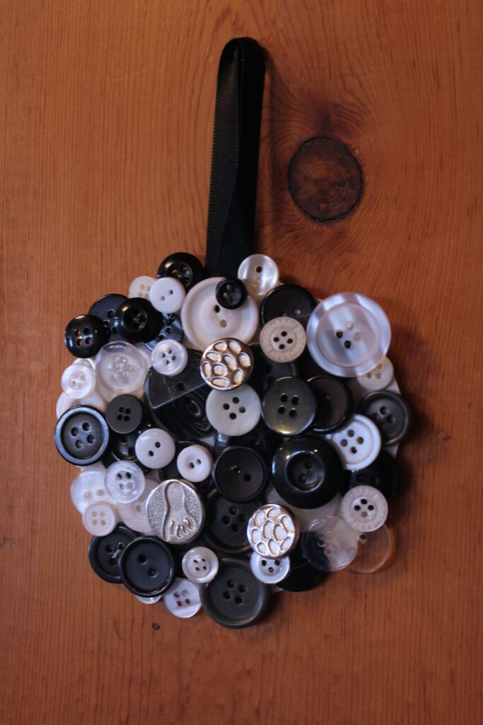 Cut out a shape in your card stock and start layering the buttons. I selected black, white and grey/silver buttons in keeping with the black and white theme of this year’s projects. Be sure to attach your ribbon first, that way you can hide the attaching point. From there, just keep layering. Do both sides if you’re going to hang it on the tree.