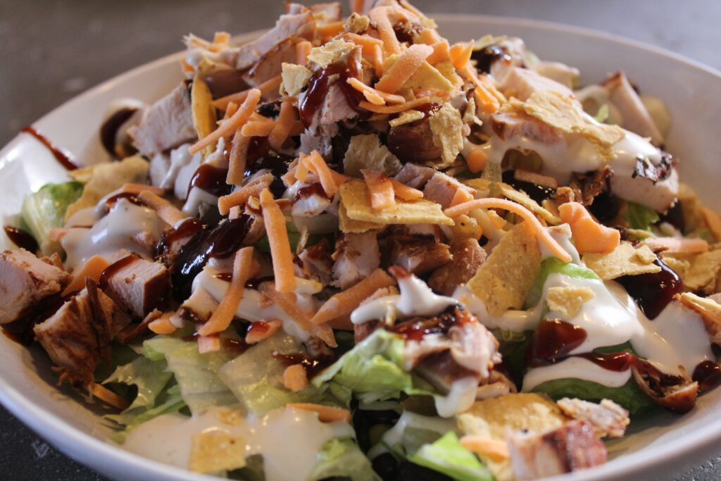 Put the salad mix in a bowl. Next, add some cheese. Then a few corn chips. Now add the chicken, diced. Then, top with bbq and ranch drizzle. Top with a bit more cheese and broken corn chips.