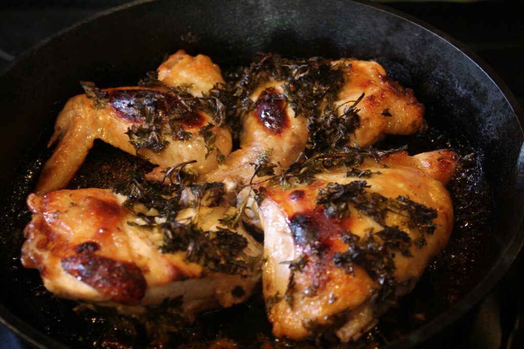 Time to grill…or put in the oven, like me! I used 2 cast-iron pans and baked the chicken at 425 for about 35 minutes. If you grill it, the chicken will take about 40 minutes to cook – cook to an internal temperature of at least 165 degrees.