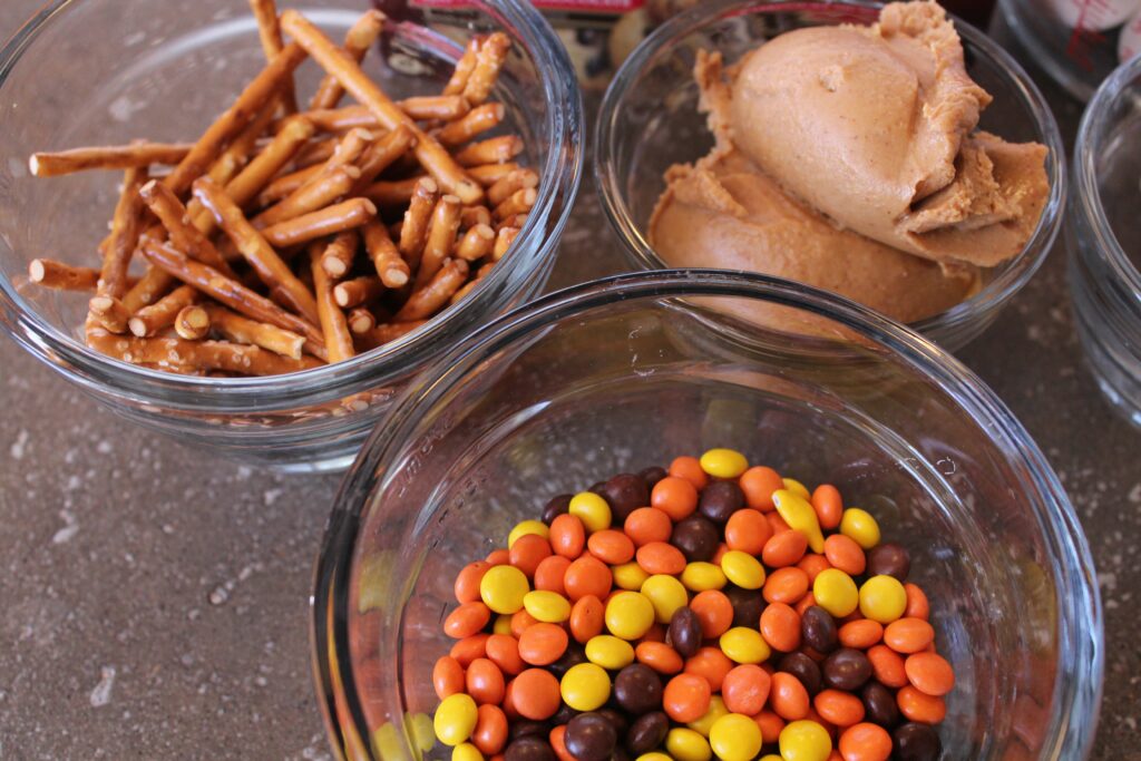 After you’ve mixed in the chex, add in 1/2 of the reeses bits and all of the pretzels.