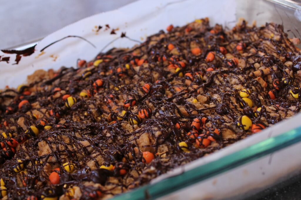 Push the mixture into a parchment paper-lined pan and then push in the remaining reeses bits.