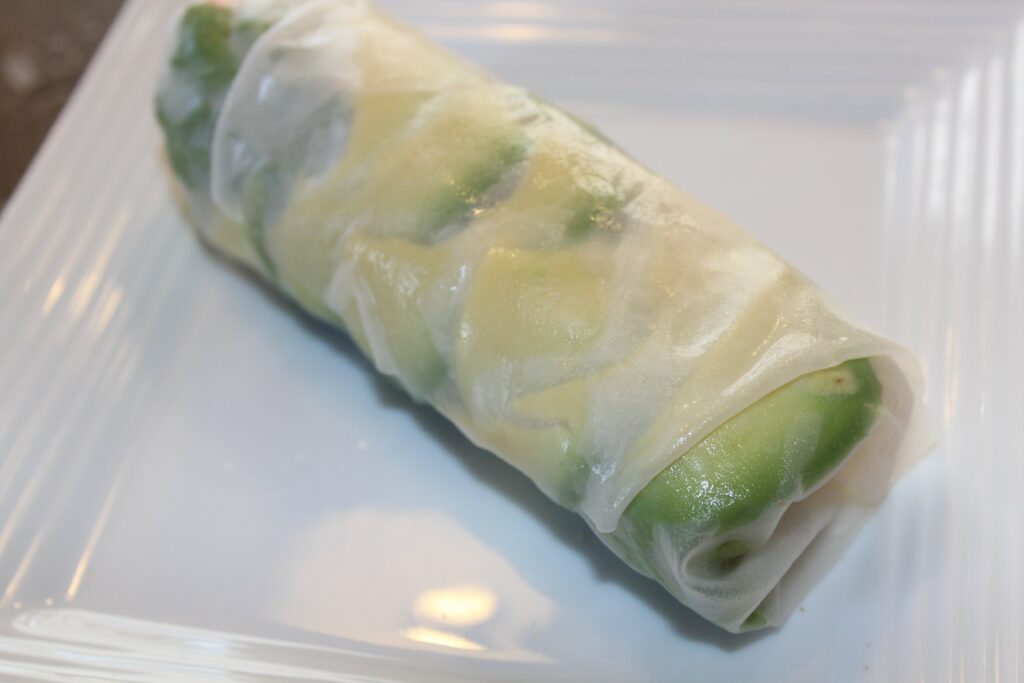 Get a bowl of warm water and get ready to ‘cook’ the rice paper. Follow the directions on the package. Only ‘cook’ one at a time – then make the roll, then repeat.