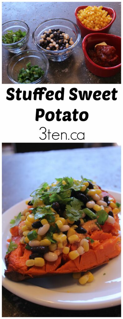 Stuffed sweet potato. Not only is this recipe good, it’s easy. We quite often have beans and corn in our fridge, so this recipe doesn’t even require a special trip to the grocery store. Total bonus. Oh – it’s meatless Monday and this recipe fits! Again, bonus.