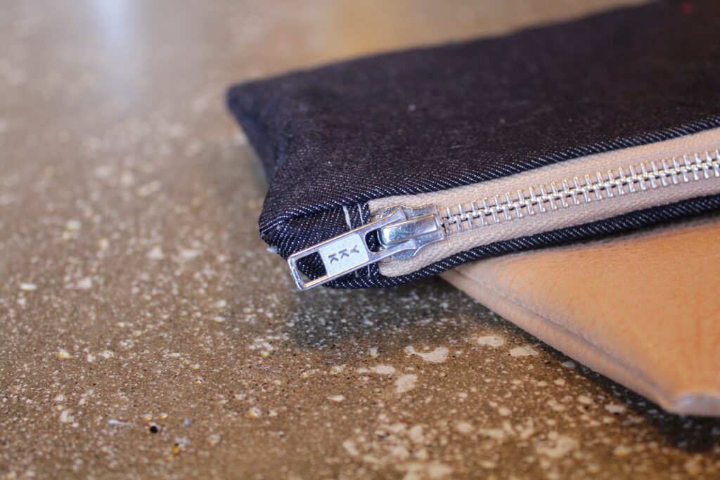 Jean and leather clutch – perfect for cool summer nights or warm fall nights. This is a bit of an upgrade off my clutch tutorial I did a while ago. Check it out, too. This one, however, has a nice and polished lining, something the other one does’t have. The other one I made you could see all the serger seams on the inside. Okay for me, but this clutch was a gift, so I needed to step it up. Plus, the zipper is far more polished on this clutch than the last, thanks to a new zipper end trick.