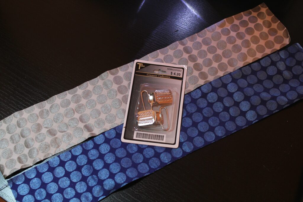 Now, at the other end – this is where you’ll permanently sew on the suspender clip. Feed the fabric though the suspender clip and top stitch in place about with about a 1 inch fold.