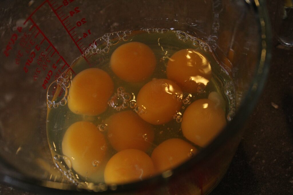 While that’s cooking – in a bowl, crack the eggs, all of them, and whisk together well. Beat them up!