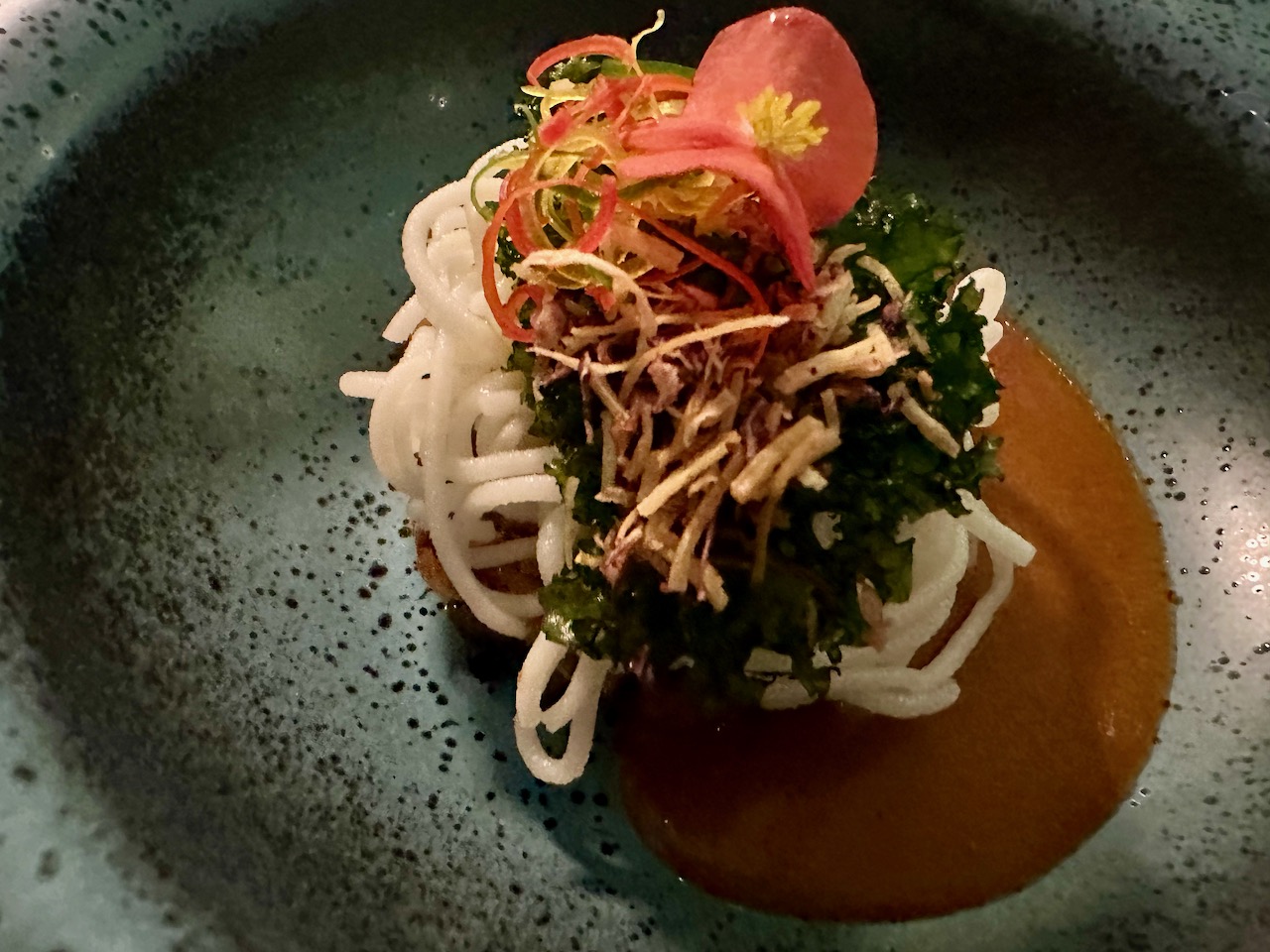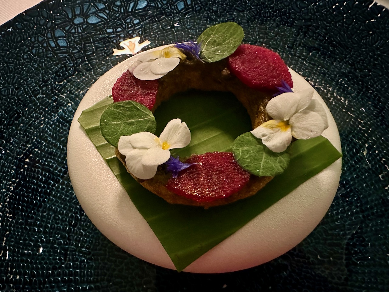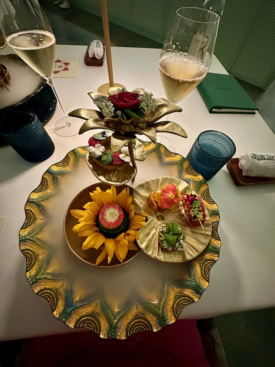 Okay, time for the first six courses – they come on a stunning tower and each bite takes you on a journey. Starting with a sweet bite topped with popping sugar, then a charred pepper and peanut relish dish, and topped off with a corn and picked radish (this one was a favourite of mine!). Then, a braised red beet, followed by a sweet potato topped with mango curry, and to finish a black lime pickle dish. So good!