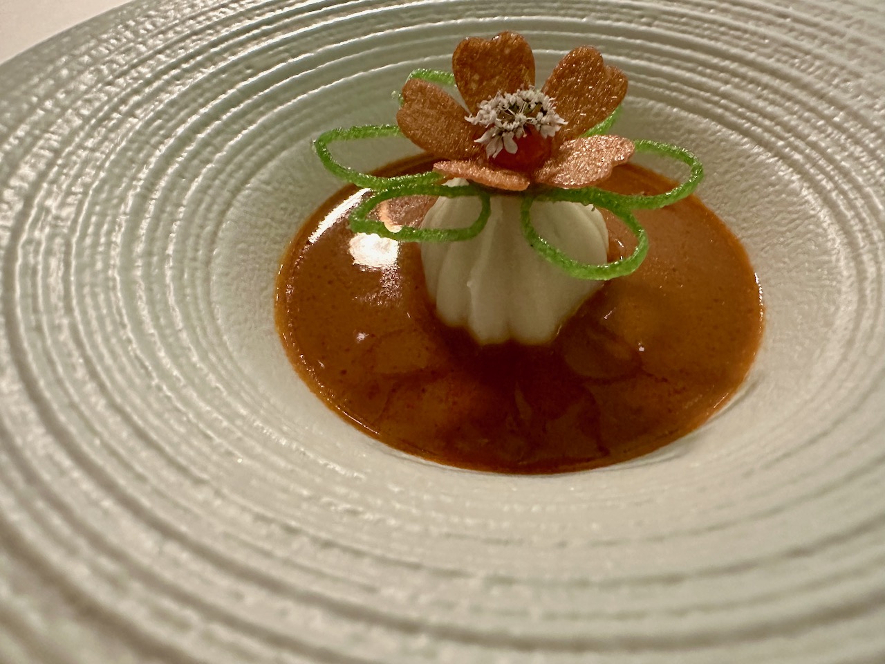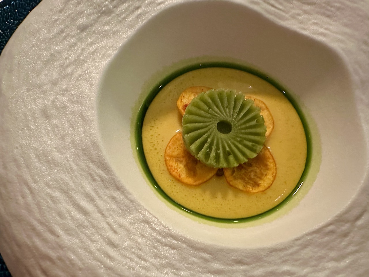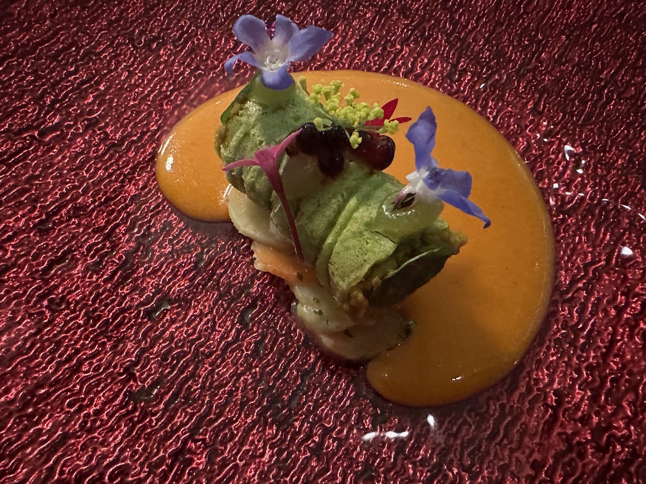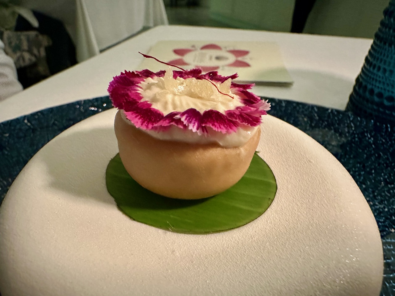 Okay, time for the first six courses – they come on a stunning tower and each bite takes you on a journey. Starting with a sweet bite topped with popping sugar, then a charred pepper and peanut relish dish, and topped off with a corn and picked radish (this one was a favourite of mine!). Then, a braised red beet, followed by a sweet potato topped with mango curry, and to finish a black lime pickle dish. So good!