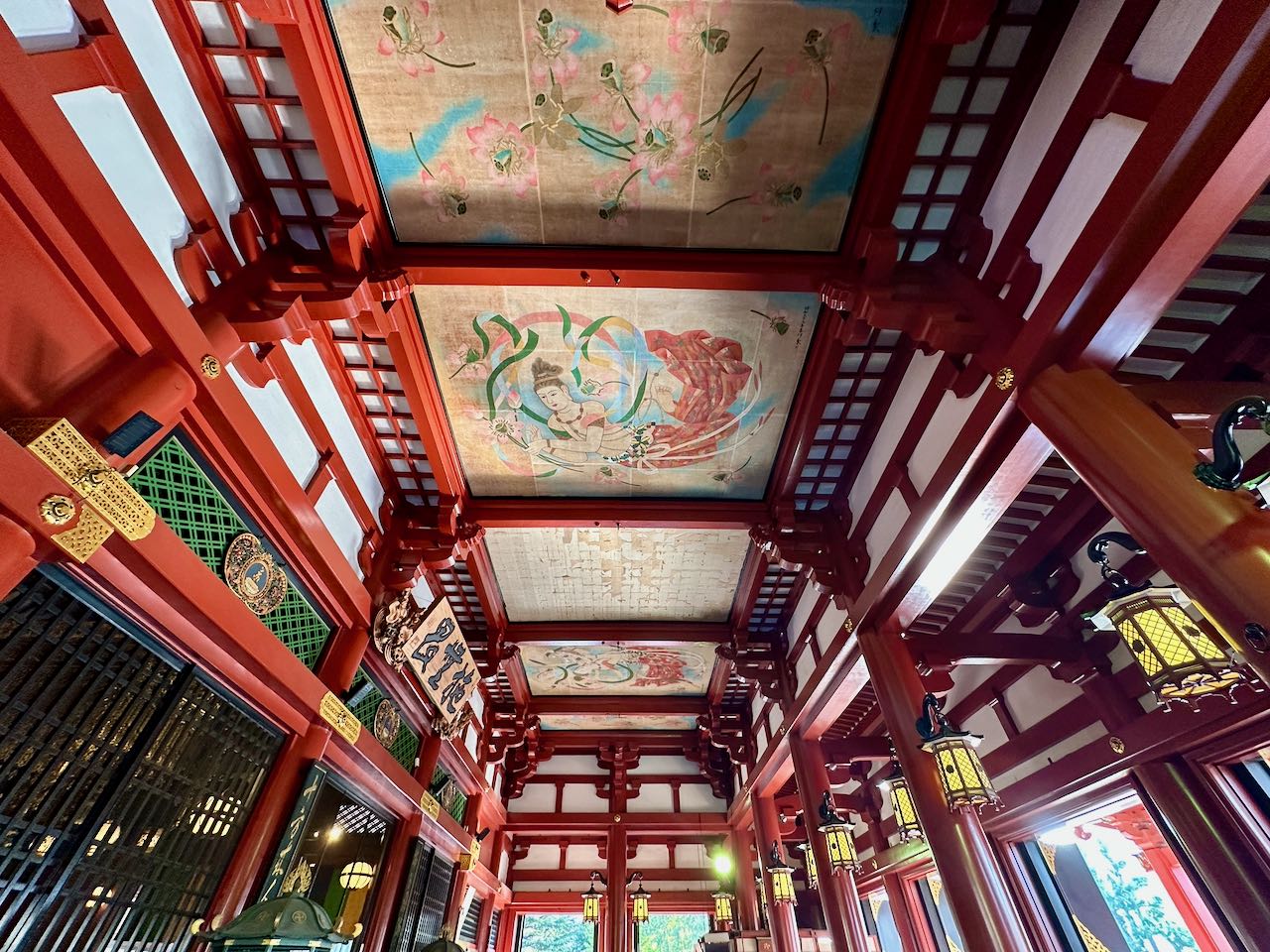 The photo below shows the ceiling of the veranda before the main hall, where the O-mikuji are on the wall in little boxes.