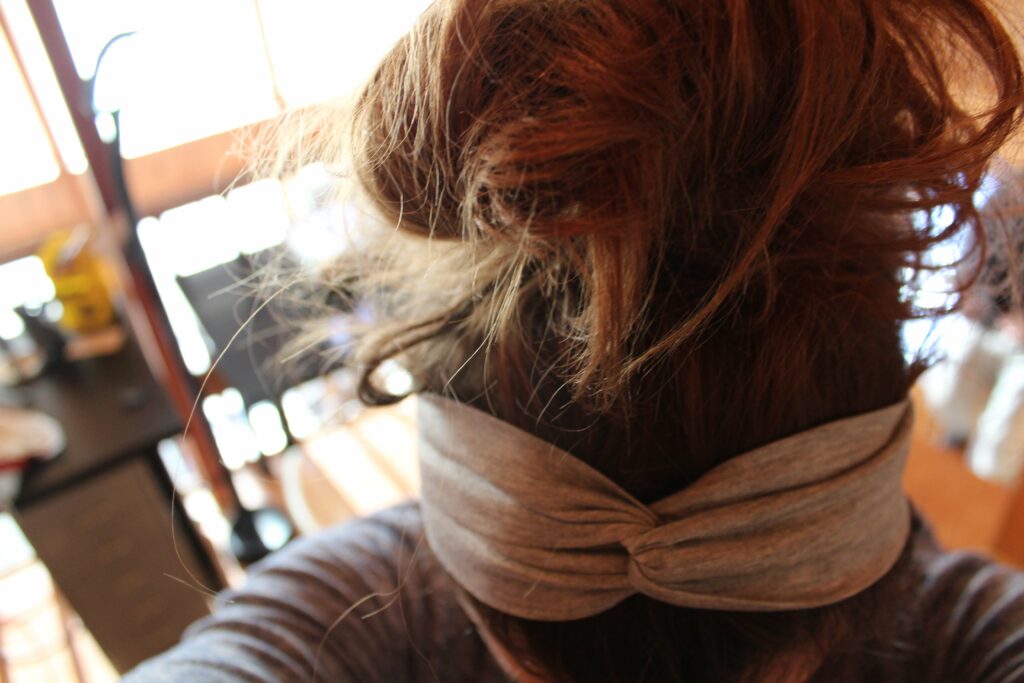 Mine measure 4 inches by 18 inches – however, next time, I think I’ll do 6 inches by 18 to get a thicker band – or even 8 inches to copy cat the harmony headband that lululemon sells for 18$. The 7 that I made cost me less than 1$ total! Nuts, eh?